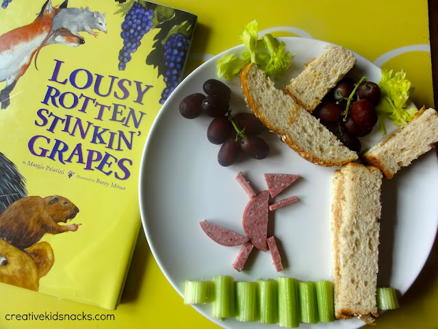 You can create the story for lunch by using a slice of summer sausage cut into a triangle, 4 sticks, and two crescent shapes to make the fox.  Next, make a tree by slicing a peanut butter sandwich as shown.  Use some cut celery for the ground and a couple of the celery leaves for the tree tops.  Finally, add the grapes, and your child will be delighted to see the story come alive!
