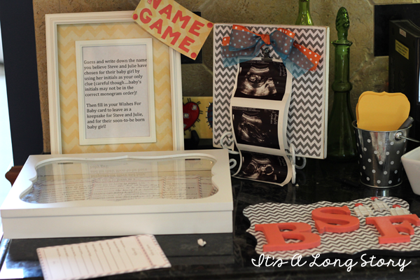 Every baby shower needs fun games. As people came into the party they had the chance to do two things. First we had some wall art with baby's initials on it. It was made to match her nursery. My friend Christine makes those photo blocks. How cute is it?