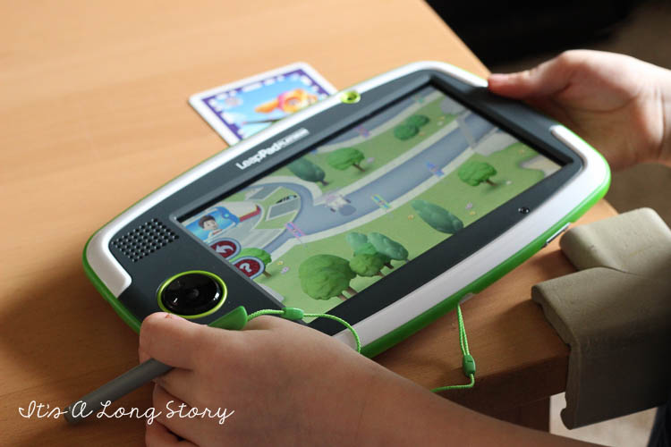 You get this deck of cards that goes along with a game. Then, using the camera on the LeapPad the game has you scan the card.